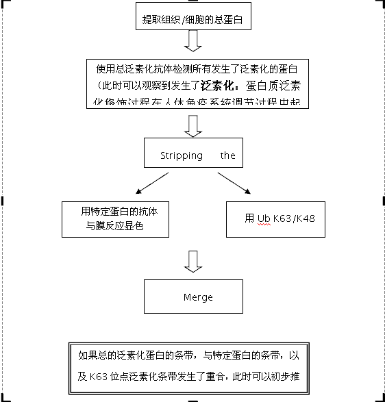 通过WB检测所有发生泛素化的蛋白条带,拍照后,将膜strip。然后与特定蛋白的抗体和特定泛素化位点的抗体反应,显色拍照。通过阳性条带的对比来初步判断某一特定蛋白的特定位点发生了泛素化