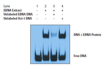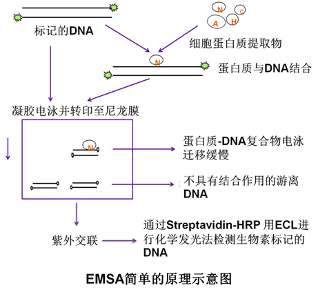 EMSA是检测蛋白与DNA形成复合体并直接相互作用的技术方法,可用于定性和定量分析,能够更准确的判断蛋白与DNA的特异性结合序列,因此蛋白-DNA复合体的识别在研究基因的表达调控中具有重要作用。这一技术最初用于研究DNA结合蛋白,目前已用于研究RNA结合蛋白和特定的RNA序列的相互作用。通常将纯化的蛋白和细胞粗提液和32P同位素或生物素标记的DNA或RNA探针共孵育,在非变性聚丙酰胺烯凝胶电泳上,分离复合物和非结合的探针。DNA-复合物或RNA-复合物比非结合的探针移动得慢。当检测如转录调控因子一类的DNA结合蛋白,可用纯化蛋白,部分纯化蛋白,或核细胞抽提液。在检测RNA结合蛋白时,依据目的RNA结合蛋白的位置,可用纯化或部分纯化的蛋白,也可用核或胞质细胞抽提液。竞争实验中采用含蛋白结合序列的DNA或RNA片段和寡核苷酸片段(特异),和其它非相关的片段(非特异),来确定DNA或RNA结合蛋白的特异性。在竞争的特异和非特异片段的存在下,依据复合物的特点和强度来确定特异结合。