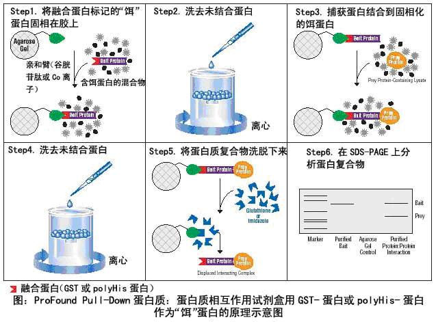 蛋白-蛋白相互作用是蛋白质结构与功能研究中最重要的方面之一。GST pull-down原理是将靶蛋白与GST融合表达,并将蛋白固化在谷胱甘肽(GSH)亲和树脂上,作为与目的蛋白亲和的支撑物,充当“诱饵蛋白”,目的蛋白溶液过柱,可从中捕获与之相互作用的“捕获蛋白”(目的蛋白),洗脱结合物后通过电泳分析,从而证实两种蛋白间的相互作用或筛选相应的目的蛋白。"诱饵蛋白"和"捕获蛋白"均可通过细胞裂解物、纯化的蛋白、表达系统以及体外转录翻译系统等方法获得。